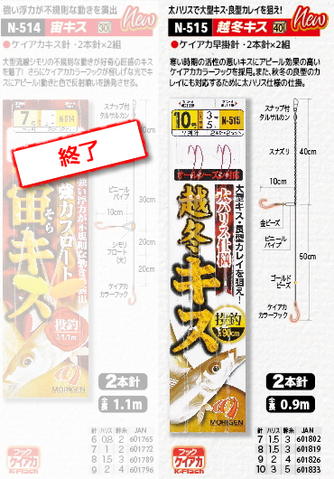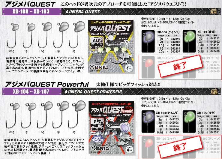 現在、投キス「N-508 カットビキス仕掛」や、アジ専用針「EV-14-7 ムツZ」、新ブランド”X-BRID”商品の「XB-100 アジメバQUEST」などに採用されています。その他商品にもビーズパーツ等が入った製品もありますよ。詳しくは「新商品情報」にてご確認下さい。